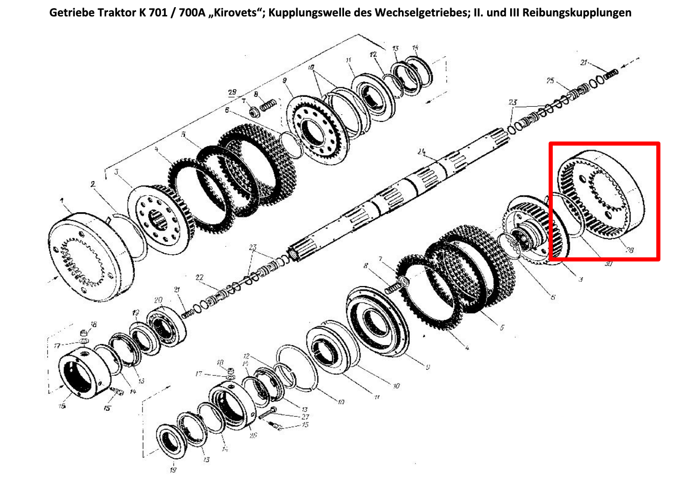 Die Außentrommel (Z=27) des 2. und 3. Getriebes ist auf der Welle 700A.17.01.010-2 des K-700-Getriebes der Traktoren Kirovets K-700, Kirovets K-700A, Kirovets K-701 sowie auf der Antriebswelle K-744 montiert. Die Trommel überträgt das Drehmoment vom Traktormotor auf das Getriebe durch Kompression der Reibscheiben ( Scheibe 700A.17.01.038-2 und Scheibe 700A.17.01.037-1 ) in ihrem inneren Teil im 2. und 3. Gang. weiter übertragen Die Drehung wird über das darin enthaltene Zahnrad 700A.17.01.045-5 und den Ring 700.17.01.498 . Sie können auch einen kompletten Zahnradsatz 700A.17.01.960P kaufen .